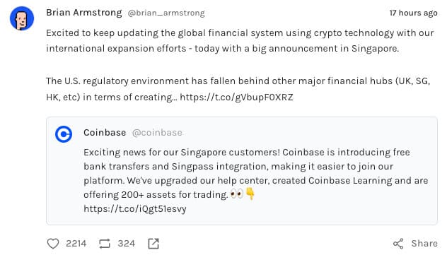 Coinbase is still grinding. Announces Singapore customers have free bank transfers