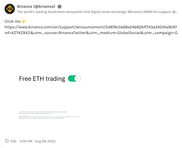 Binance has decided it’s taken enough of our fees and starts offering free trades on Eth now as well.