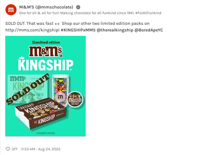 Bored Ape M&M’s sell out their KingShip edition while two remaining. Charmin is next with a BAYC toilet paper edition (maybe?).