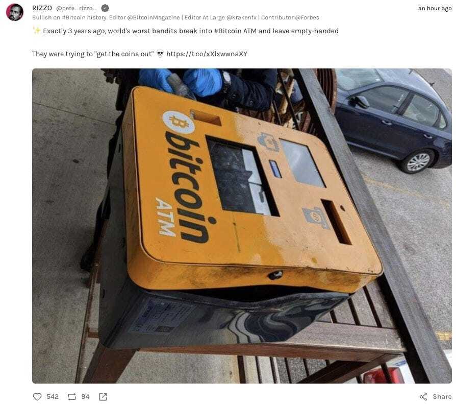 3 years ago, bandits tried to break into this Bitcoin ATM, they left empty-handed. Thankfully the machine was all out of coins. (Ba dum tssst)