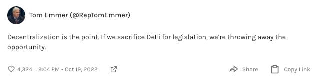 Representative Tom Emmer, everyone’s favorite crypto supporter in Congress, tweeted about Decentralization. Pump it, Tom!