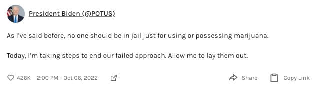 Unrelated to crypto, President Biden pardons anyone convicted of Federal marijuana possession