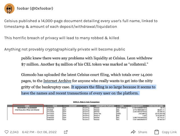 Celsius published a 14,000 page document with every user’s full name and links to amount of each deposit/withdrawal/liquidation. This is not good.