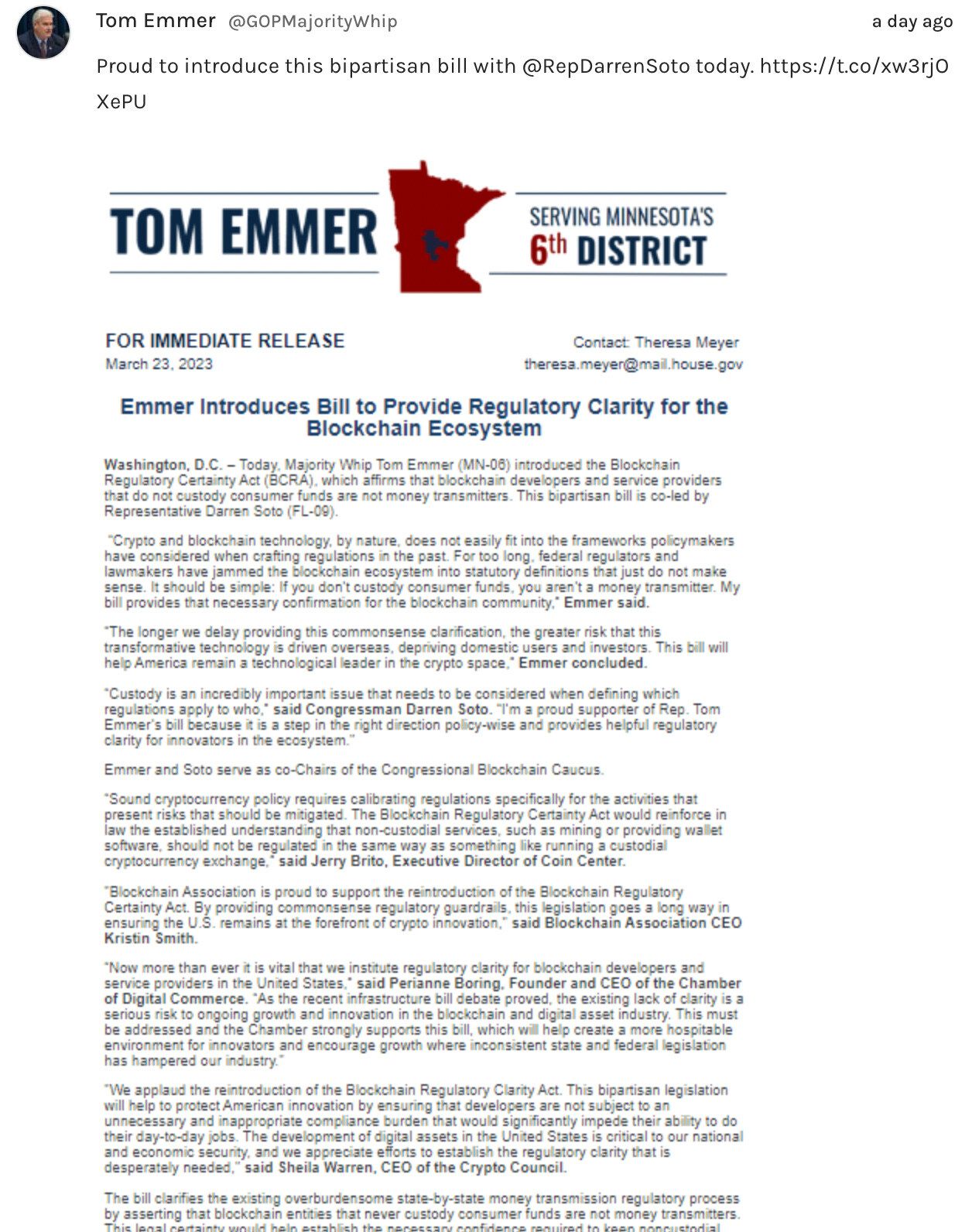 Rep Tom Emmer introduces a bipartisan bill to help provide regulatory clarity for Blockchain ecosystem