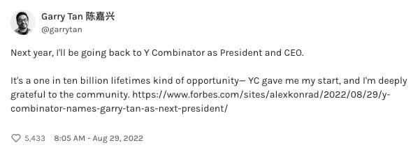 The legend, Garry Tan, is going back to Y Combinator as President/CEO