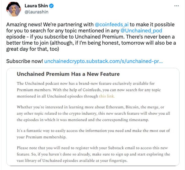 We’re happy to announce we are continually expanding our advanced podcast search by partnering with Laura Shin and Unchained Podcast. You can now search for any specific topic on Unchained Podcast and find the topic in their podcasts.