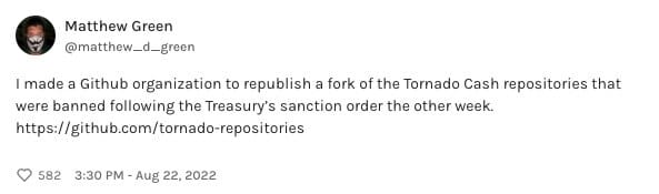 Matthew Green republished a fork of Tornado Cash repositories that got banned