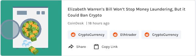 This fits with her campaign for re-election; Senator Warren’s bill won’t stop money laundering (although difficult to do) but could possibly ban Crypto