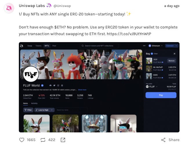 Uniswap announces you can purchase NFTs with any ERC-20 token