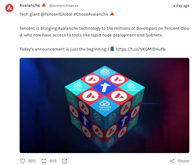 Tencent Global announced they are bringing Avalanche technology to their Cloud