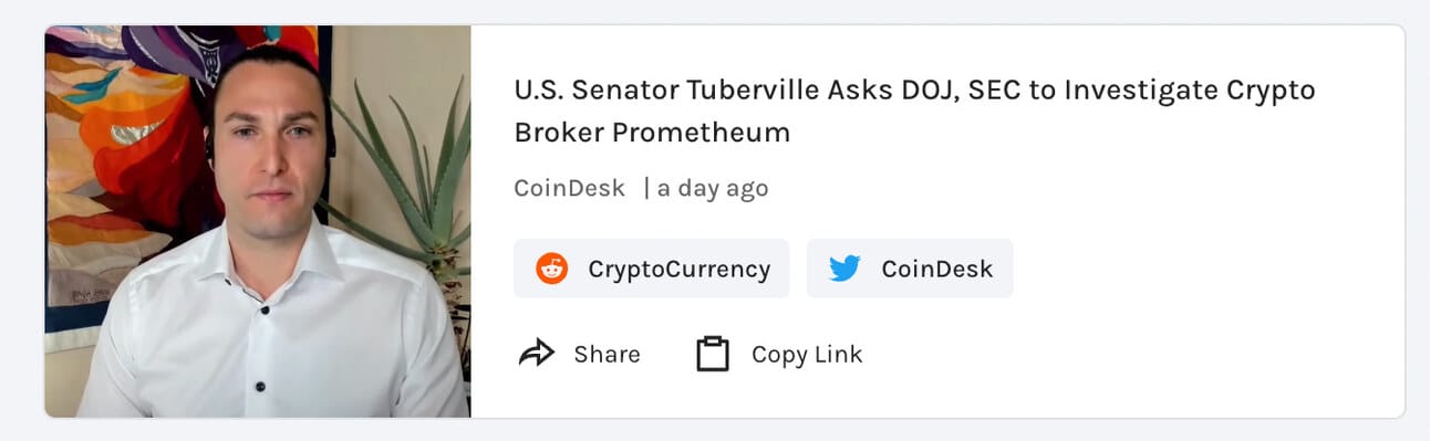 U.S. Senator Thomas Tuberville has requested an investigation into Prometheum, a crypto broker, alleging potential violations of U.S. securities laws and false testimony to Congress. This highlights the ongoing regulatory scrutiny in the crypto space.