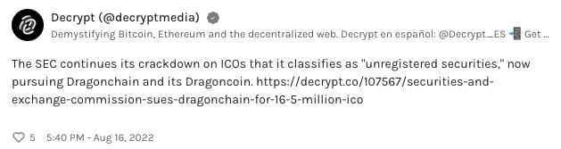 SEC sues Dragonchain and it’s Founder for unregistered crypto asset security offering