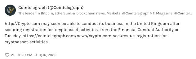 Crypto.com appears to have gotten a “cryptoasset activities” registration in the UK.