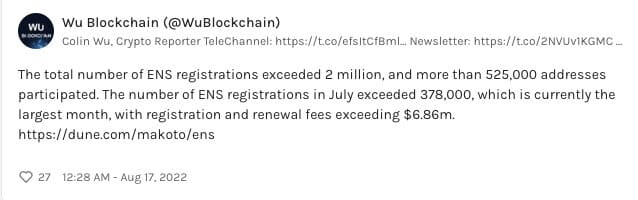 ENS registrations surpass 2 million with more than 525,000 address participating.