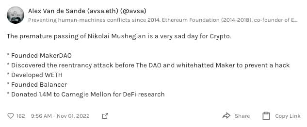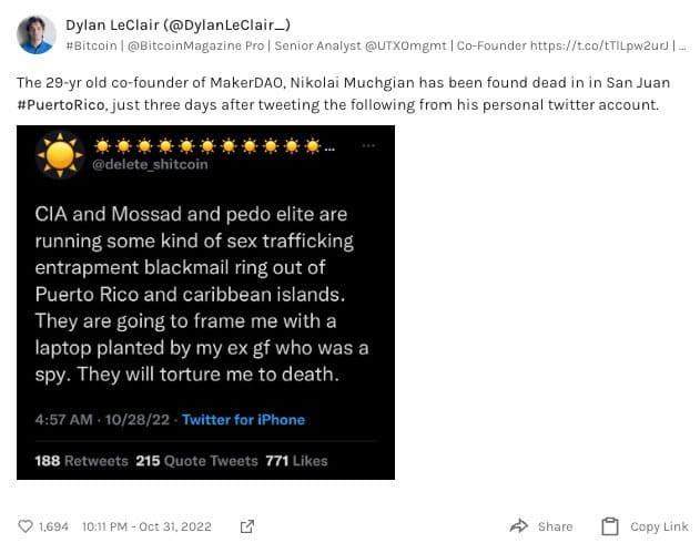 A little deeper dive into the death of Nikolai Muchgian, co founder of MakerDAO. Alarming to say the least.