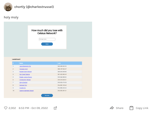 Holy moly is exactly right. An alleged list of the top 10 people and how much they lost with Celsius Network.