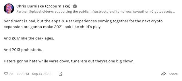 Chris Burniske gives us all bullish hope when crypto sentiment is at an ATL. Seeing the advancement from 2013 to today can really help Chris’s thoughts when you think about the next cycle.