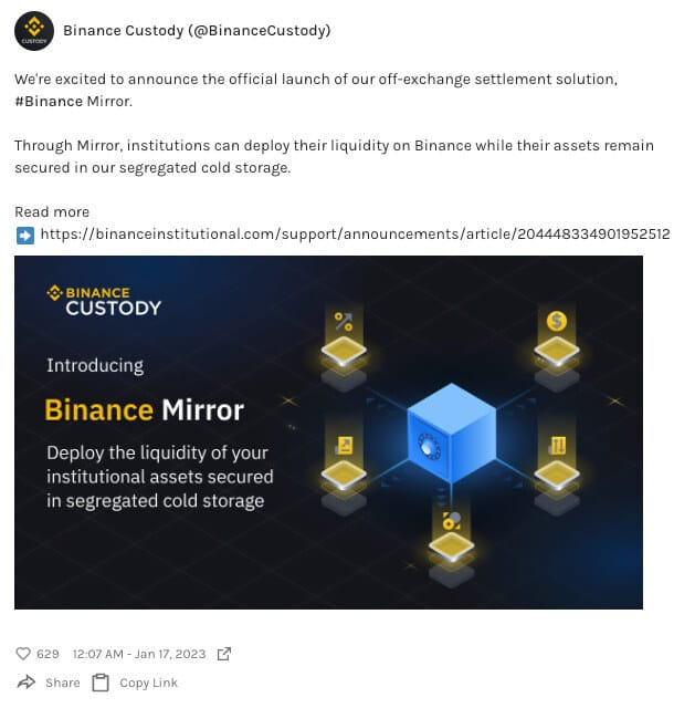 Binance launches Binance Mirror, an off-exchange settlement solution