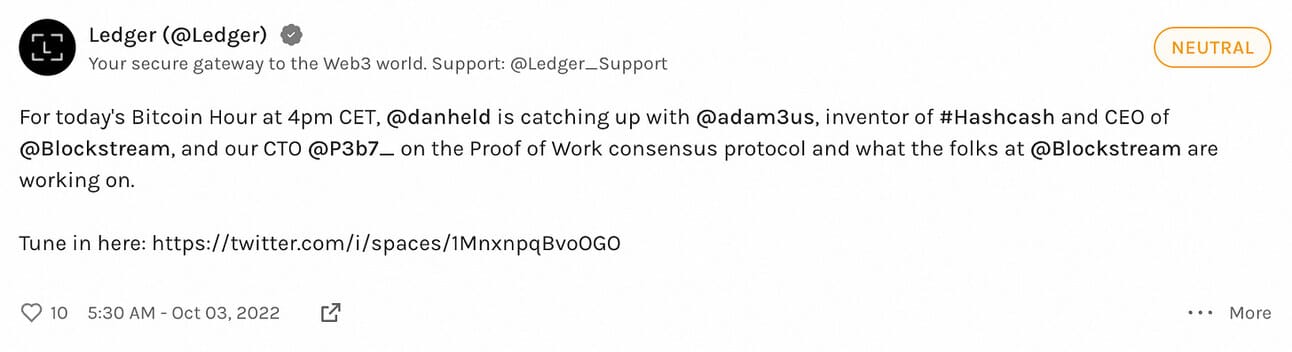 Ledger to host a Twitter Spaces today with Dan Held and others