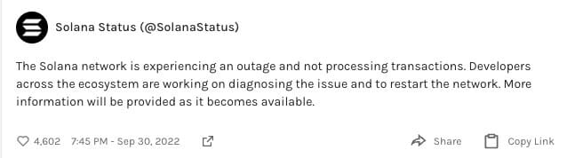 Solana goes down and restarts at slot 153139220, the last confirmed slot.