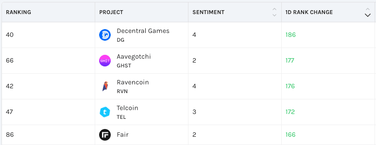 Yearn Finance (+86): Speculation that MKR will utilize Yearn and allocate $100MToken Proof (+127): Wrapped up 45 events in 5 daysDecentral Games (+186): 2 year anniversary, hosted a metaverse party to celebrate