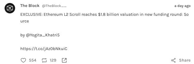 Ethereum L2, Scroll, reaches a $1.8B valuation in new funding round