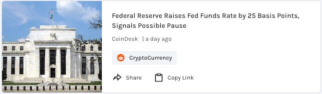Memecoin WSB rugs. SEC changed how it officially labeled Digital Assets. Judge gives SEC order to respond to Coinbase. We’re 75% of the way to the next Bitcoin halving. Coinbase to remove this feature on May 10. CEX volume is down. Fed raises rates 25 basis points.