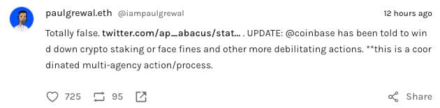 There was rumors circulating that Coinbase had been told to wind down staking or face fines. Then Coinbase’s Chief Legal Office came out and said it was totally false. Coinbase’s CEO, Brian Armstrong, did say that he’s hearing rumors the SEC would like to get rid of crypto staking in the US.