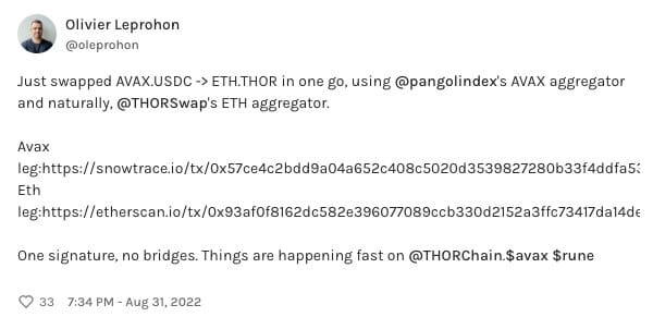 AVAX.USDC → Eth.Thor, no signature, no bridge. All done by using ThorSwaps Eth aggregator and PangolIndex, tech advancement right here.