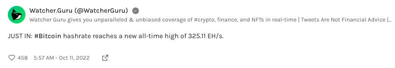 BTC hashrate reaches a new all-time high of 325.11 EH/s