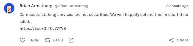 Brian Armstrong, CEO of Coinbase, says they will happily defend in court that their staking services are not securities