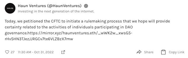 Haun Ventures petitioned the CFTC for some rule making process that will give clarification for individuals that participate in DAOs