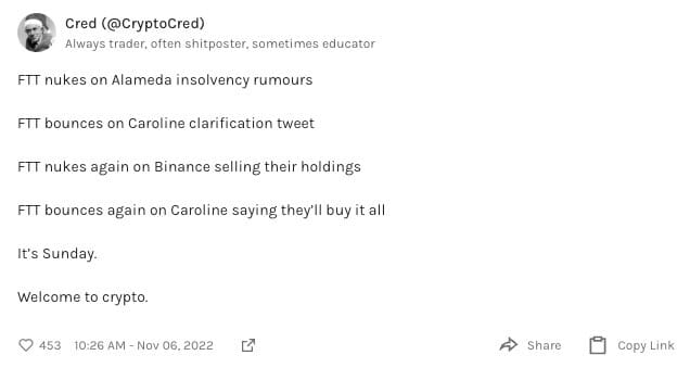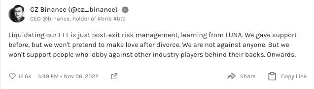 What a weekend between CZ and FTX/SBF. CZ tweets that Binance will be liquidating their FTT position. CZ indicates reasoning as: comparing to Luna and said won’t support people who lobby against the industry. Hinting that SBF has been doing so.