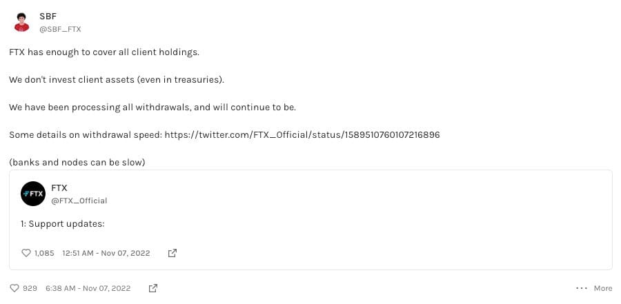 Rumors start piling in that FTX is insolvent and consumer funds from the exchange seem to be on the move, causing FTX to send more funds to the exchange.