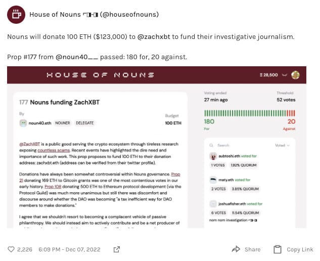 Nouns DAO is donating 100 Ethereum to Zachxbt, on chain sleuth who keeps scammers at bay