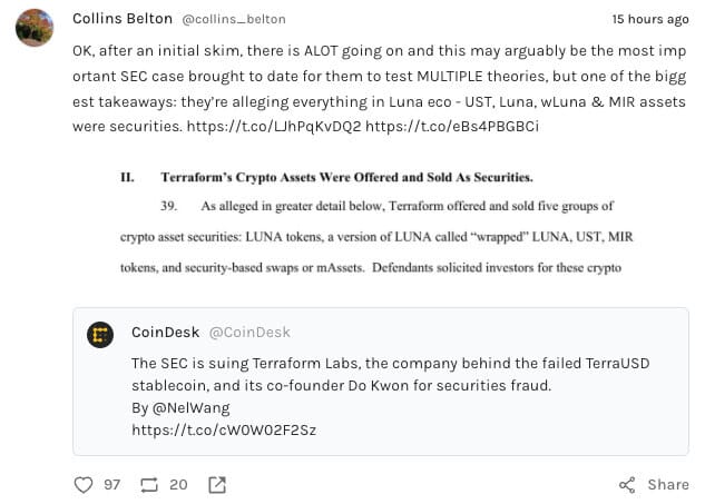 What a day! SEC sues Terra/Do Kwon. SEC lawsuit reveals a third party helped restore peg back in 2021. Platypus was exploited and hacker found within hours. Arbitrum is live on Coinbase. Have a great weekend!