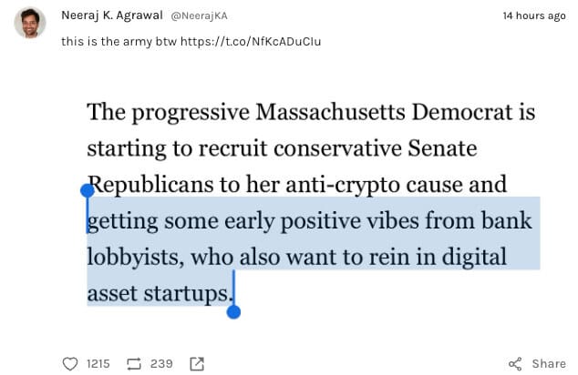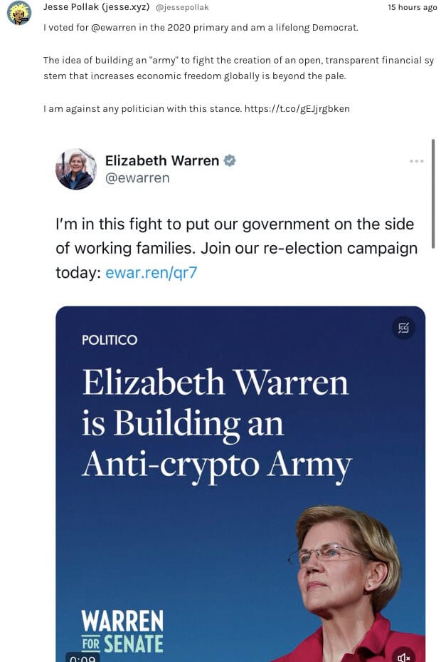 Senator Elizabeth Warren puts out a campaign ad that she’s building an Anti-crypto Army. Embarrassing to be honest.