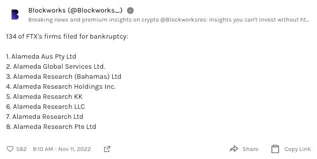 FTX files for bankruptcy, includes FTX US and 133 other entities/Firms. See the entire list here.