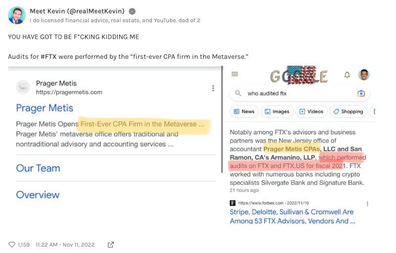 Audits for FTX were performed by the “first-ever CPA firm in the Metaverse.” This type of stuff, seriously, cannot be made up