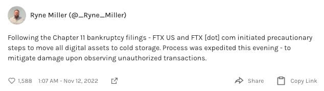 FTX US GC comes out and says (hours after the funds move) that they were moving funds to a cold wallet