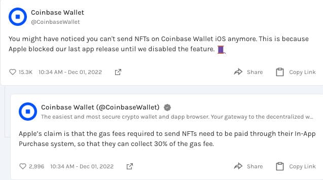 Apple disabled Coinbase Wallet NFT sending due to the cost of gas to send.