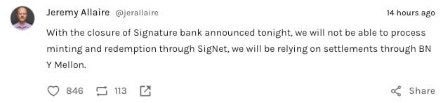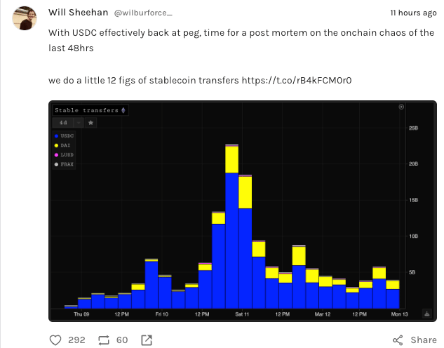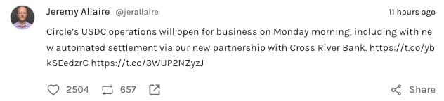 There were growing concerns and depegging of USDC over the weekend. It got down as low as $0.85 over the weekend. Circle CEO put some worries to rest